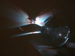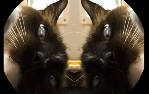 Cat Eyes: Four Eyes is a water filled glass sculpture mis-shaping a video projection of a cat face. The cat’s face is close and intimate – also mirrored giving the cat more idiosyncrasy and power.