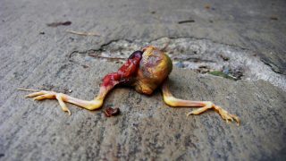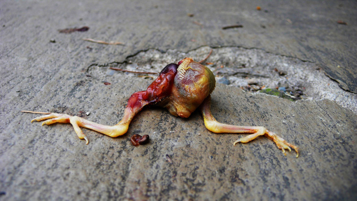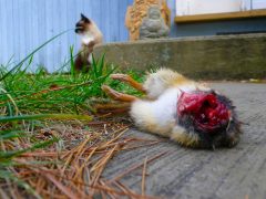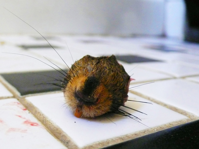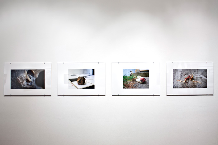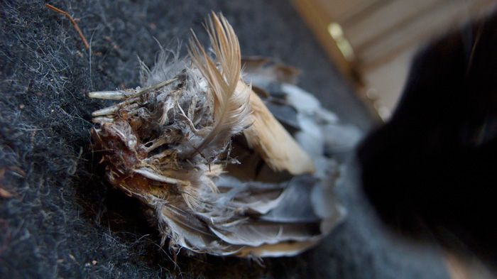 A series of odds and ends brought home as offerings by the cats: a bottom of a bird a tip of a chipmunk, a gnarled mass of feathers and bone. Photographed with the hunters who collaborate in many of the artworks.