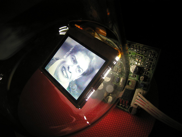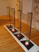 In an ersatz laboratory, a penthouse living quarters for the rats sits next to four large “tube-scopes,” 40” high glass sculptures for viewing films of human and non-human animal “becomings” – or animal/people transformations – becoming werewolves, vampires, exploring the shifting space between humans, monsters and beasts. The rat housing resembled a small city, with one section a tower for climbing, and one section a park. Daily a “lab technician” came to feed and check on the rats, perform the duties of care-taking.
