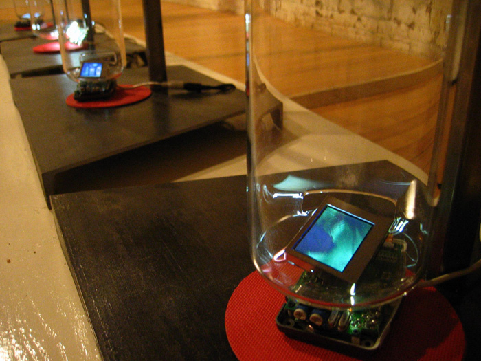 Site-specific, mixed media installation with glass tubes, video, sound, live transgenic laboratory rats in extended rat habitat, computer terminal with website.