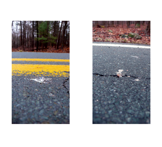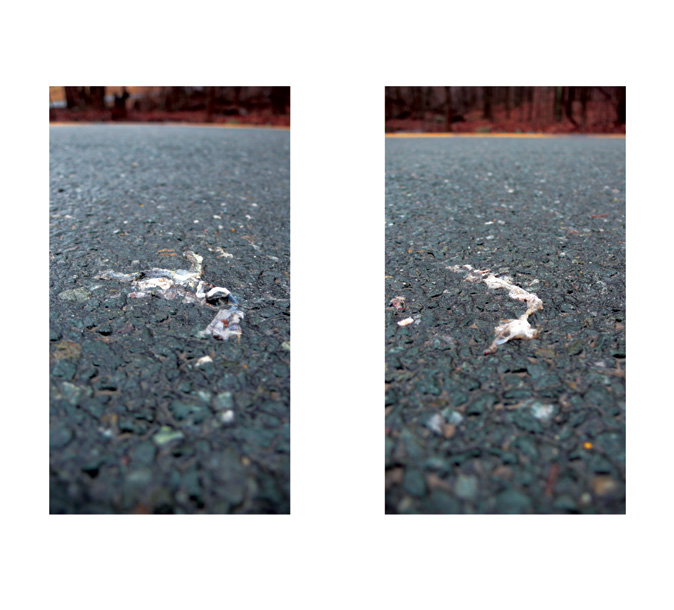 Vertical landscapes photographed as if submerged by the road, these sets of images capture the pathos of an everyday animal mishap. Squashed by tires on an ordinary road, these peeper frogs have little left but a slimy glimmer of their past forms.  Seeping now into the crevices of the road the viewer gets pulled into their textured perspective. Beyond their remains the horizon stretches out dramatically and two yellow lines whiz by comically—a sudden reminder of inconsequential bumps.
