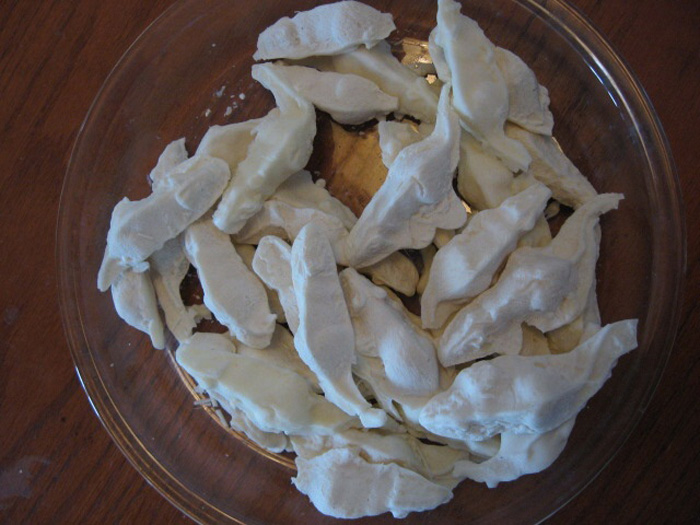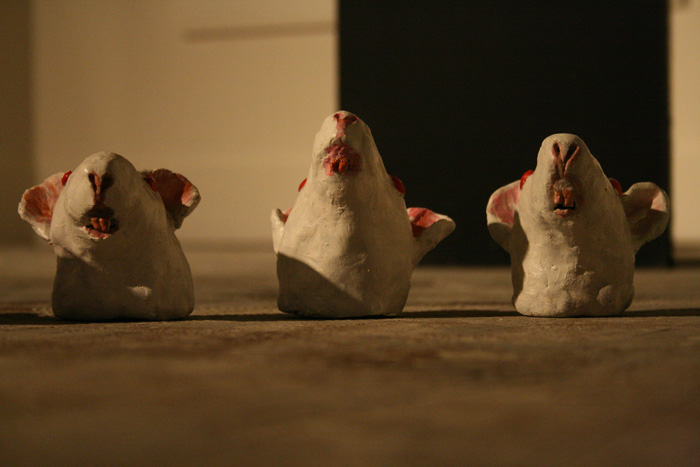 Edible white chocolate lab rats and sculpted decapitated rat heads in honor of the rats used in research – created for feminist group show.