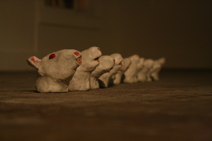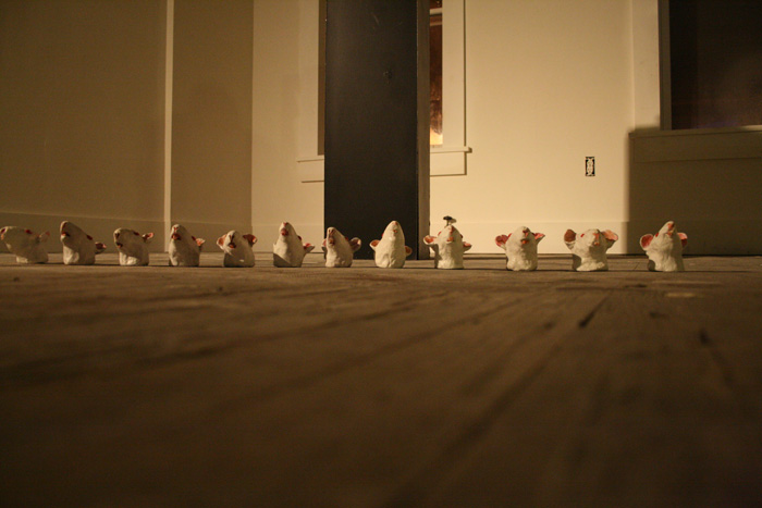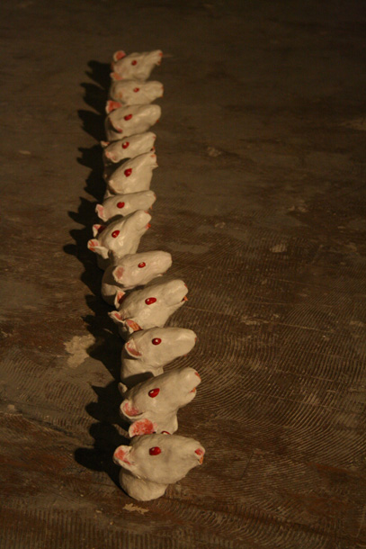 Site-specific installation of a bowl of white chocolate rats and 12 4-6″ sculpted clay heads of albino lab rats.